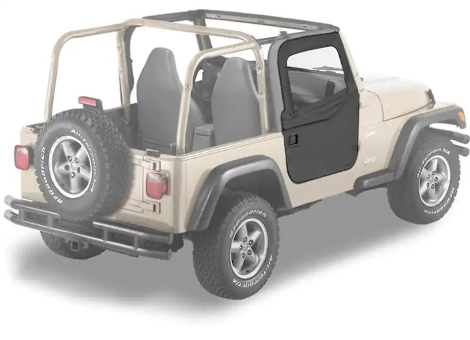 2-Piece Door Kits offer passenger and driver side upper and lower complete with Rotary or Paddle Handler kits. Compatible with Supertop, Sunrider, and Halftop. Snug fit is ensured by using adjustable lower door pins and door collars. Velcro to fasten upper and lower doors together. Double-bulb weather stripping surrounds the door to facilitate a good seal. Exterior fabric color matches Bestop and factory original soft tops. All Bestop Jeep doors are easily adjustable for a weather tight fit.